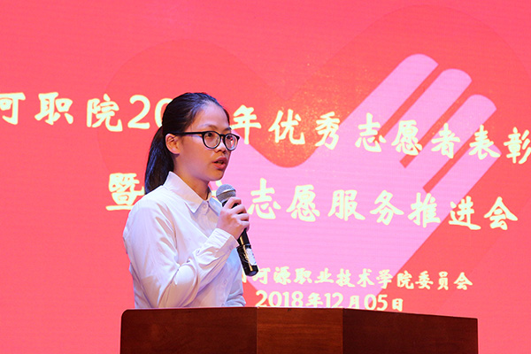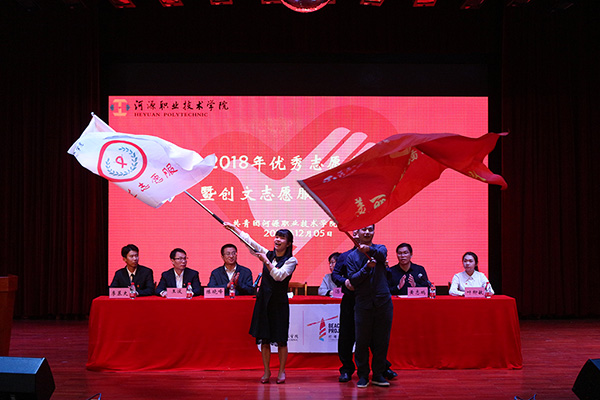 大会在庄严的国歌声中拉开帷幕。接着,在王波副书记宣读2018年我校优秀志愿者表彰决定后,汤剑冰副主席、陈晓峰书记上台为优秀志愿者颁奖。随后,各优秀志愿者代表分别上台发言,他们均结合自身实际经历及岗位分享了自己的志愿心得,并承诺将继续坚守自己岗位,积极投身志愿服务活动,为志愿服务活动及河源创文奉献青春力量。紧接着,赖新优部长为禁毒防艾志愿服务队、美丽乡村墙绘志愿服务队授旗。最后,大会在全体奏唱团歌中圆满落幕。