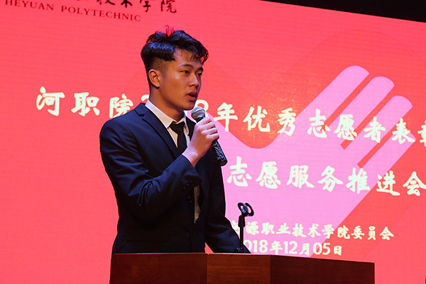为深入贯彻落实习近平总书记视察广东重要讲话精神,纪念国际志愿者日,进一步培育和践行社会主义核心价值观。12月5日,我校于艺术楼演播厅隆重举行2018年优秀志愿者表彰大会暨创文志愿服务推进会。我校党委委员、宣传部部长赖新优,校工会副主席汤剑冰,团委书记陈晓峰,校团委副书记黄志鹏、王波,校团委学生副书记李慕史、叶柳敏,各二级学院团总支书记,各项志愿服务项目指导老师代表,学生干部代表及志愿者代表等均参加此次大会。大会由黄志鹏副书记主持。