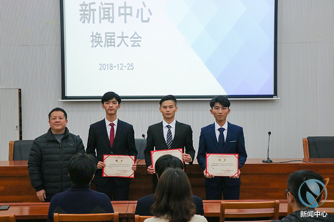 大会在全体奏唱国歌的歌声中拉开序幕。新闻中心第十三届团长杜晓博分别从思想、学习、工作和生活这四个方面做了简要的总结,希望日后自己和新闻中心全体成员能不断加强思想政治修养,提升自我,秉承原则,不忘初心、牢记使命。随后,由邬占乾老师宣读新闻中心第十四届学生干部名单,赖新优部长、张素芬主任和黄舒老师分别为新一任学生干部颁发聘书。