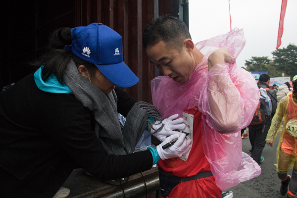 志愿者为选手发放运动饮料