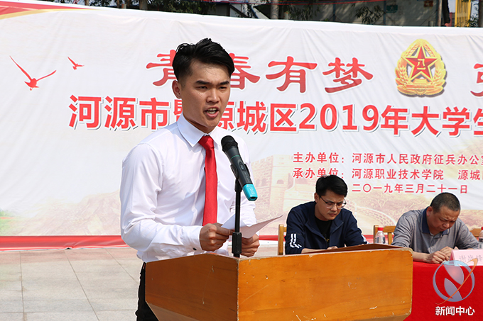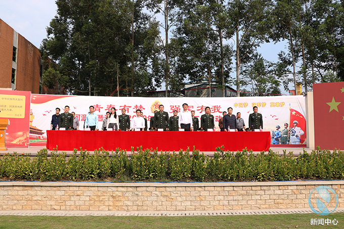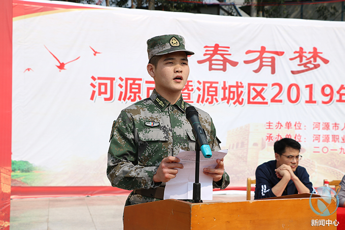 3月21日下午,河源市2019年大学生征兵启动仪式在我校足球场举行。我校校长陈德清、副校长唐汉芳,河源市军分区副司令员李国,市委宣传部,市教育局,市理工学校及各县(区)主管征兵工作有关领导、师生代表共1200余人参加了启动仪式。