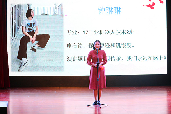 来自各二级学院的15名学生选手汇聚一堂,通过演讲的方式,回顾“五四”爱国运动的历史画卷,阐述“五四”爱国精神的时代内涵,重温习近平总书记在纪念五四运动100周年大会上对新时代中国青年提出的六点要求,抒发职业人生梦想,展示青春时代风采。全校300多名学生代表在观看和聆听中受到鼓舞,进一步明确了当代青年在新时代中国特色社会主义事业和实现中国梦进程中的光荣使命。在题目为《青春应如夏花般璀璨》的演讲中,选手抒发了青年应努力奋进的愿望;《铭记五四,把握今日》中选手自然流畅、感情真挚,将现场气氛推向高潮;《青春的翅膀》演讲语速恰当,感染力强,表达出对五四运动青年的敬仰;《当下》的演讲流畅干净,张弛有度,获得观众的热烈掌声。