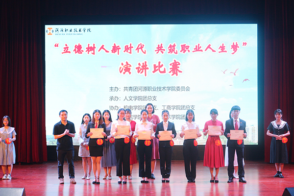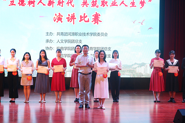 为认真学习贯彻习近平总书记在纪念五四运动100周年大会上的重要讲话精神,贯彻落实“德智体美劳”的教育方针,积极宣传宣传习近平总书记关于“德技并修、工学结合”的重要指示精神。5月14日晚,我校于艺术楼演播厅举行“立德树人新时代,共筑职业人生梦”演讲比赛。学校团委书记陈晓峰,团委全体老师,各学院团总支书记,参赛选手和各学院学生代表均参加了此次活动,人文学院副教授郑尔君、思政部基础教研主任郭慕卿以及艺术学院老师宋丽娟担任本次比赛的评委。