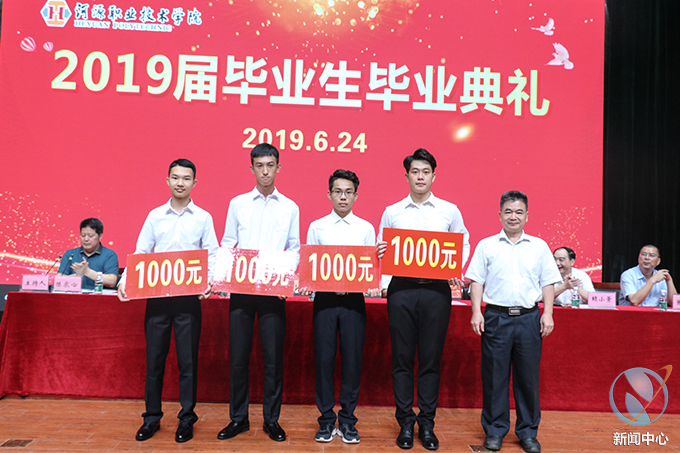 赖小景副校长宣读了《关于表彰2019届全国职业学院技能大赛获奖学生的决定》。叶国英副书记为在2019年全国职业院校技能大赛中荣获全国三等奖的11名同学进行颁奖,唐汉芳副校长为全国职业院校技能大赛荣获全国二等奖的4名获奖学生进行颁奖。