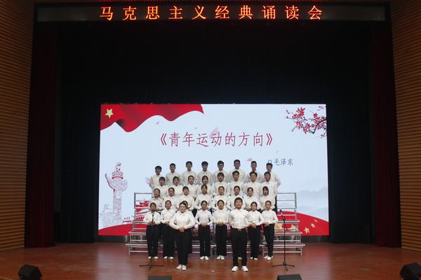 在诵读会中,各组学员以整洁的着装、饱满的精神轮番上阵,伴着婉转的旋律和铿锵有力的节拍,声情并茂地朗诵了《十九大报告》节选、《在纪念马克思诞辰200周年大会上的讲话》、《习近平在北京大学师生座谈会上的讲话》、《在纪念五四运动100周年大会上的讲话》、《习近平在纪念红军长征胜利80周年大会上的重要讲话》、《青年运动的方向》、《反杜林论》、《全体中华儿女的共同向往》等经典名篇。