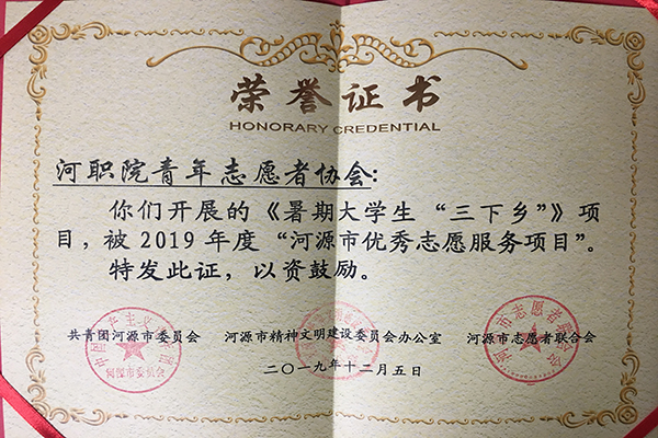 我校青年志愿者协会获2019年度“河源市优秀志愿服务项目”荣誉