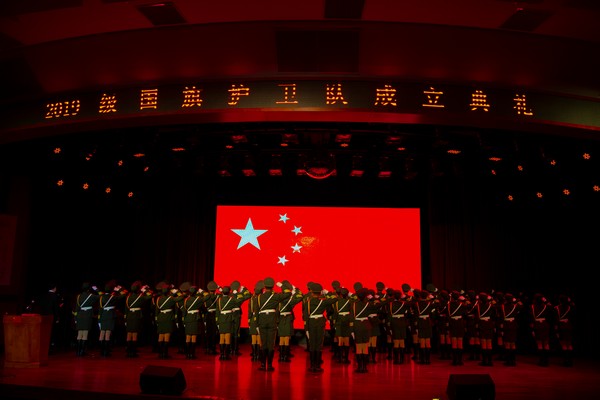 活动伊始,全体人员观看2018级国旗护卫队活动回顾及2019级国旗护卫队筹建情况视频。在团委陈晓峰书记上台宣读《关于成立2019级国旗护卫队及机构设置的决定》之后,主持人宣布2019级国旗护卫队成立典礼正式开始。伴随着庄严肃穆的国歌,典礼进入授旗、授臂章仪式,韦荣书记、陈德清校长以及赖小景副校长分别为大队长、教导员、副大队长颁授国旗、校旗、队旗。黄建华处长、赖新优部长、汤剑冰主任与欧阳玉娟处长先后为队员授予臂章。随后,国旗护卫队全体成员在国旗下郑重宣誓:“以我火红青春谱写国旗礼赞,用我生命热忱捍卫国旗尊严。”