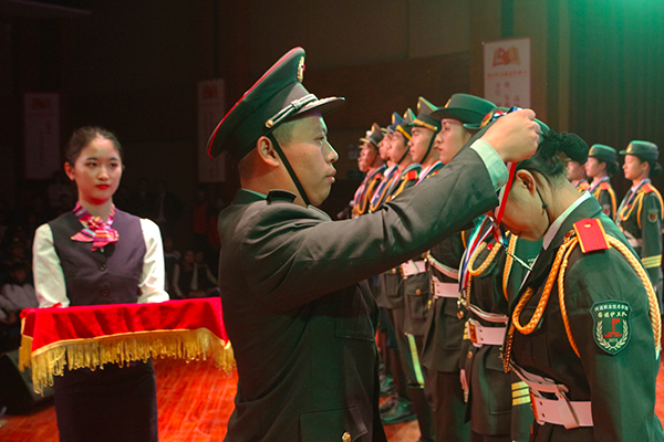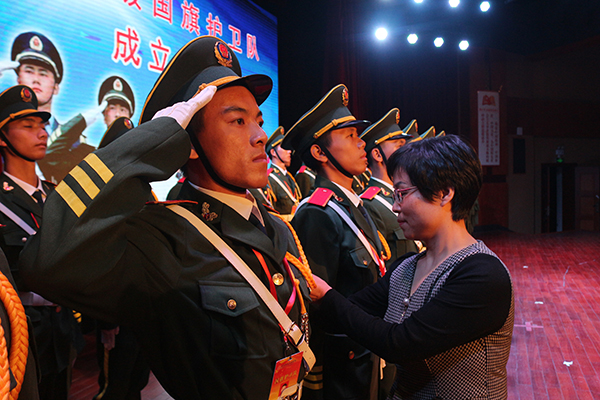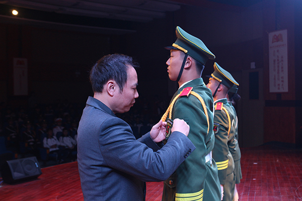 我校国旗护卫队教官黄旺庆为退役队员颁授徽章