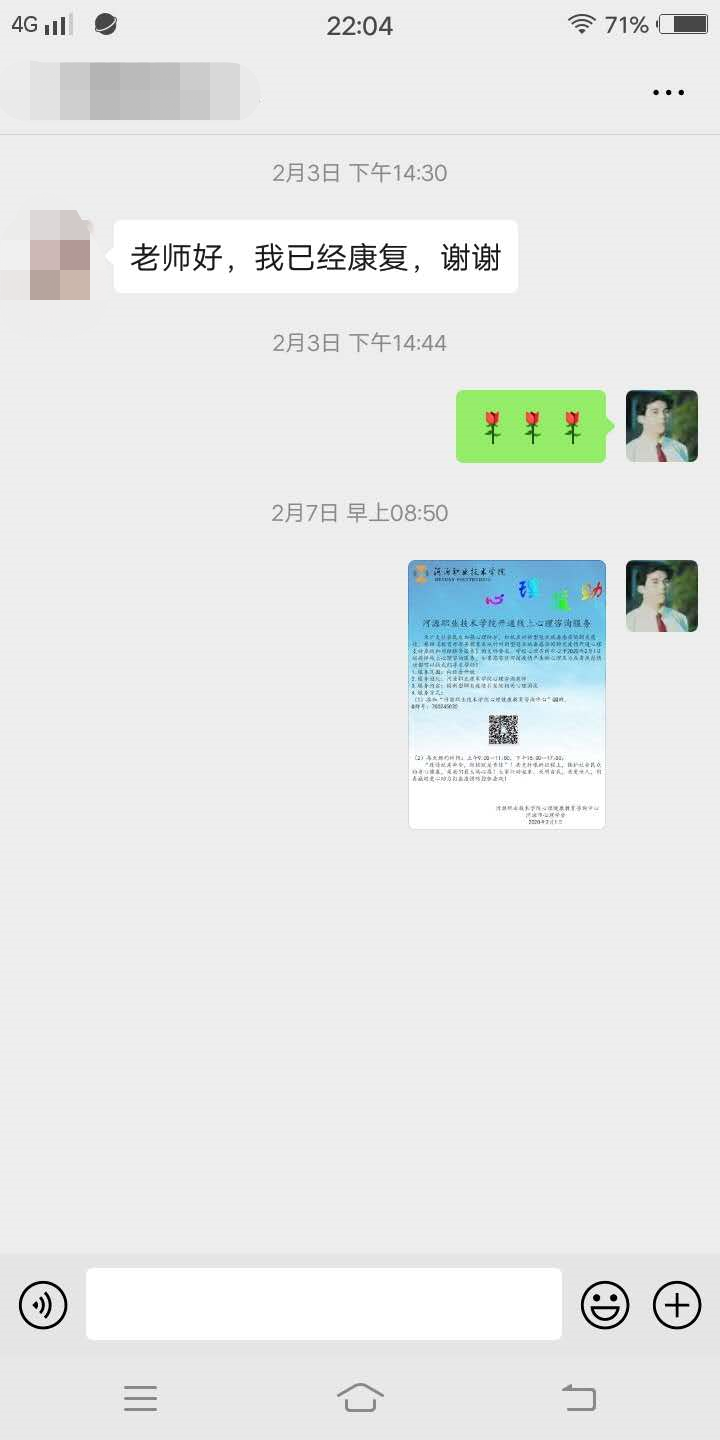 学校心理咨询中心大力拓展了心理健康教育资源,面向社会,于1月26日开始启动“线上心理咨询援助”接受校内外求助者。2月1日正式向社会发布“线上心理援助平台通道",钟碧来并且对河源市志愿者认真培训了“线上心理援助”服务的基本要求、基本心理知识、咨询原则和方法、线上心理危机干预与沟通技术等工作内容。开通线上心理援助至今,共有210次人咨询,其中严重抑郁者共3人(均有自杀行为和倾向,校内1人,校外广州2人)在线上心理危机干预成功,效果理想,学生因疫情造成心理困惑和恐慌。为加大心理援助力量,钟碧来组织王淑敏、叶玲老师一起坚守线上心理援助岗位为广大民众服务。