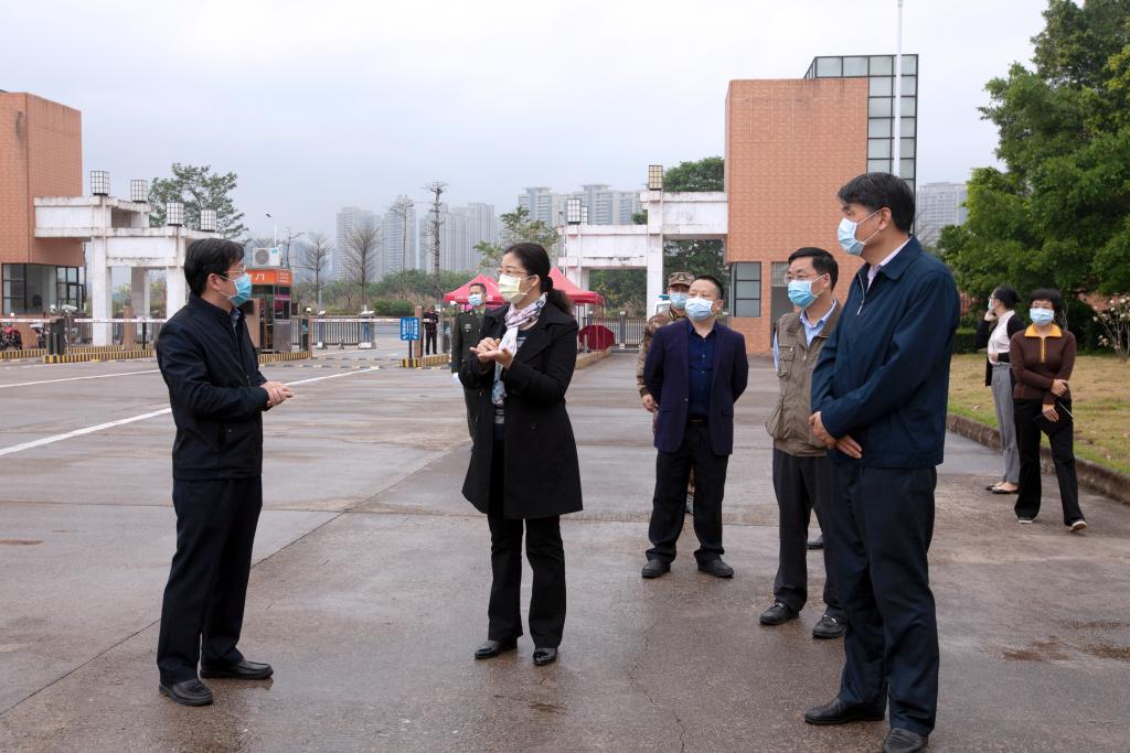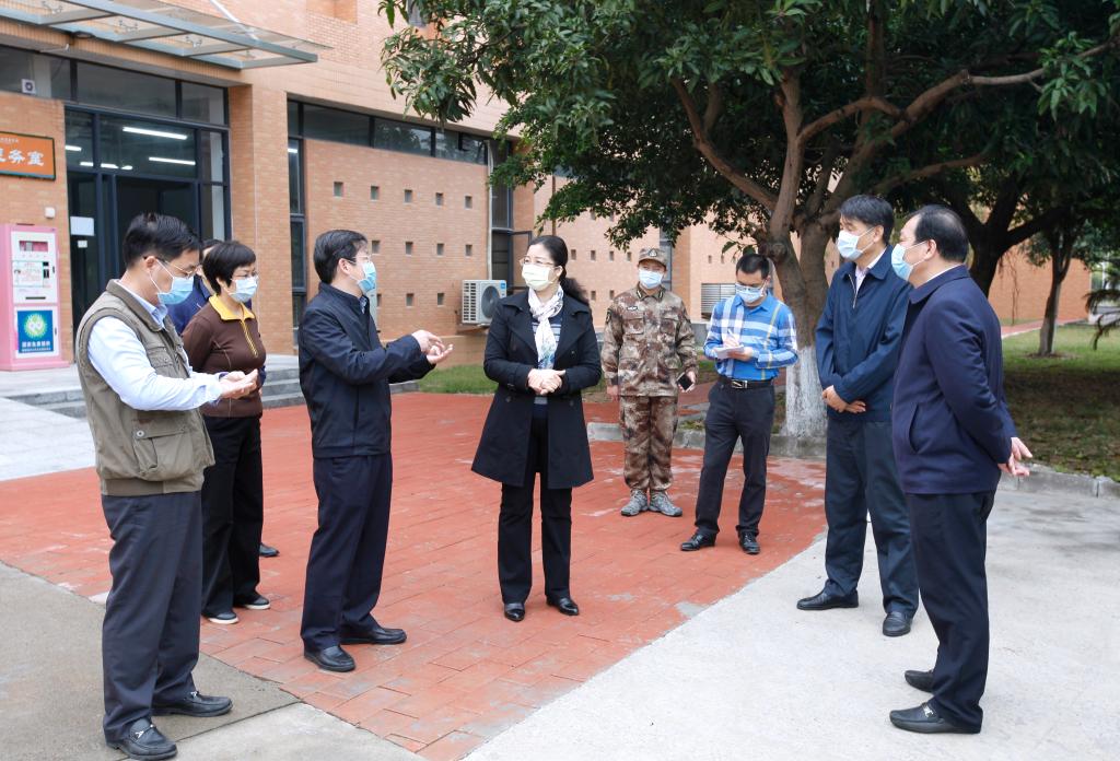 3月3日上午,市委常委、宣传部部长朱蔚蔚、市教育局局长刘国才一行来到我校检查疫情防控和开学准备工作。校党委书记、防控工作领导小组组长韦荣,校长、防控工作领导小组组长陈德清和副校长、防控工作领导小组副组长王小宁陪同检查。