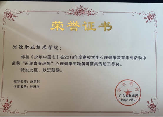 近日,广东省2019年度高校大学生心理健康教育系列活动评选结果揭晓,我校在心理漫画、主题演讲及公益广告三项活动中获奖。其中,艺术学院苏娜老师指导廖子琪同学的《梦想住在我身上》心理漫画获得二等奖,机电学院廖若莎老师指导张民、张圣镁同学的《阳光旅程》公益广告和机电学院赵雯钊老师指导钟琳琳同学的《少年中国志》主题演讲获得三等奖。