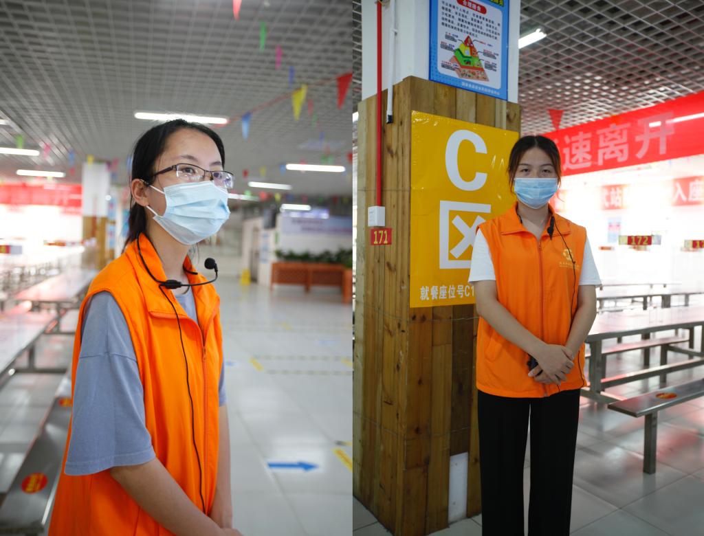 饭堂督导志愿者们会在开餐前提醒同学在饭堂不就餐时全程带好口罩,饭前洗手,引导师生有序排队、分桌就餐,针对就餐期间交流攀谈现象进行文明劝导,有效提升个人防护能力。结束就餐后,志愿者会回收餐盘,引导同学从出口处离开。保障了疫情期间在校师生饮食安全和身体健康。