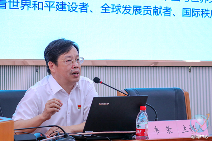 会上,韦荣书记以《习近平谈治国理政》第三卷的“形成背景”“主要内容”“重大意义”三个方面作重点讲解。《习近平谈治国理政》第三卷生动记录了党的十九大以来,以习近平同志为核心的党中央着眼中华民族伟大复兴的战略全局和世界百年未有之大变局,不忘初心、牢记使命,统揽伟大斗争、伟大工程、伟大事业、伟大梦想,团结带领全党全国各族人民推动党和国家各项事业取得新的重大进展的伟大实践。《习近平谈治国理政》第三卷与先期出版的第一卷、第二卷,构成一脉相承,是新时代中国特色社会主义的理论创新成果。对外传播中国好声音,讲好中国故事,让国际社会了解中国领导人治国理政的思想和理念。