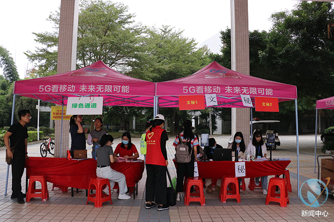 10月16日上午,我校人文学院2020年迎接新生工作在中庭拉开帷幕,根据疫情防控要求,我校2020级新生分批次,错时错峰入学,同时积极做好疫情防御工作。所有新生到达学校西门后,在志愿者和工作人员指引下有序排队,依次进行健康码验证、行李消杀、更换口罩、体温检测等环节后进入校园,由学生志愿者引领到教学楼中庭报到处办理入学手续。