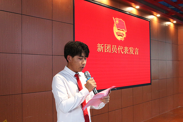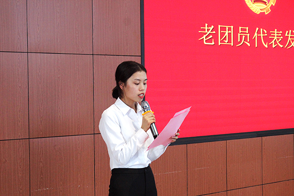 随后,由新团员代表毛启航进行发言。他表示,将会以共青团团员这个新的身份勉励自己不断学习新知识,履行好作为一名团员的义务和权利,提升自身思想意识及道德素质。紧接着,王宇微作为老团员代表进行发言,她认为新团员应自觉树立崇高理想,按照团员标准严格要求自己,在团组织领导下,努力学习、不断进取,真正从思想上加入到团组织中去,为团组织的工作和活动增添光彩。最后,陈晓峰书记向加入共青团的新成员们表示热烈祝贺,并鼓励青年人要立大志、敢担当,将个人理想融入民族复兴伟大理想和中国特色社会主义思想,充分发挥出生力军和突击队作用。
