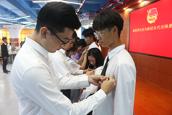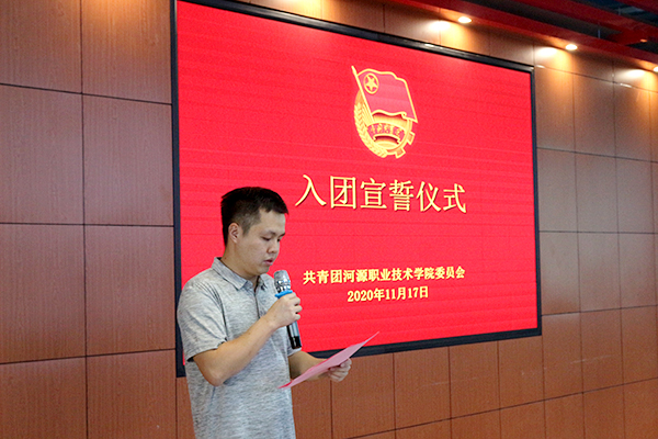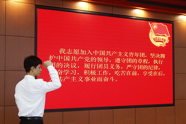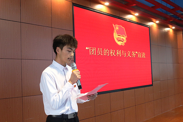 入团仪式在庄严的国歌声中拉开帷幕。活动伊始,由黄志远主任宣读新团员代表名单,并由老团员代表上台为新团员代表佩戴团徽。在学生会副主席吴佛鸿的带领下,全体新团员面对鲜艳的团旗,进行庄严宣誓。宣誓结束,学生干部王俊郑重宣读《团员的权利与义务》,从思想、政治、组织上对团员的言行提出了基本要求。
