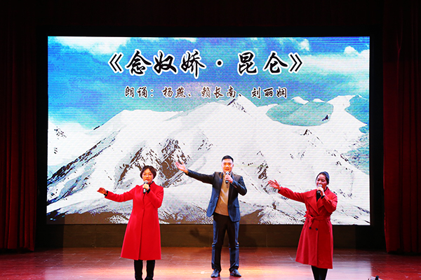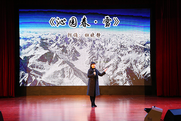 主持人通过毛泽东同志的诞生及事迹引出本次朗诵会的主题。活动以一首《五言诗•挽易昌陶》朗诵开场,紧接着,朗诵者们怀揣着崇敬之情,采用多种形式的朗诵方法及多种呈现形式,纷纷登台进行诵读表演。其中,我校国旗护卫队身着军装,为我们献上充满豪情壮志的《杂言诗•八连颂》,彰显了大无畏的男子气概及中华儿女对社会主义事业的坚定信念;二胡独奏《北京有个金太阳》曲调轻快愉悦、委婉动听,表演者用带有藏族的演奏风格,以乐传情,抒发了对祖国的热爱;学校党政办的老师们带来慷慨激昂、气势磅礴的压轴节目集体诵《人的正确思想从哪里来》。最后,朗诵会在全体人员合影留念中落下帷幕。整场活动带领观众回顾了毛泽东同志的一生,歌颂了新中国逐步走向繁荣昌盛的光辉历程,引发了大家对毛泽东同志的深切缅怀及敬佩。