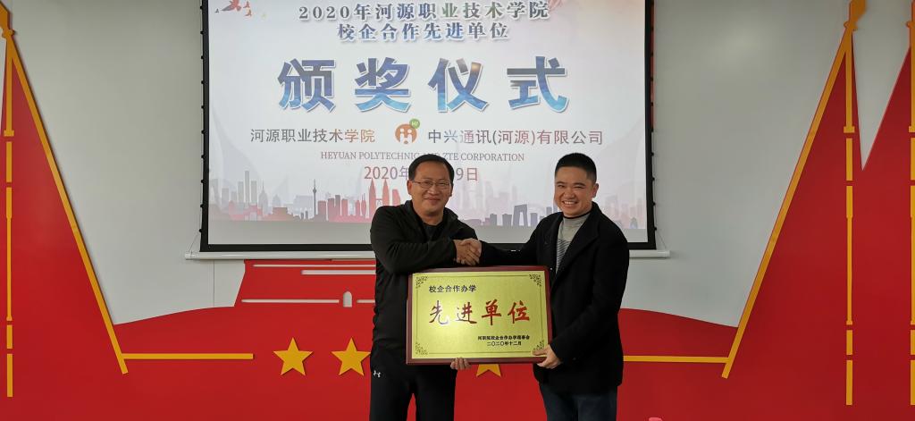 在接下来的仪式上,由袁光华副校长、 中兴通讯(河源)有限公司李新华部长和18移动通信技术1班的江仕良同学一起完成了第四届“中兴订单班”三方协议签订仪式,全体与会人员一起见证了三方签约的神圣时刻。接着,本仪式又举行了2020年易游app入口站官网校企合作先进单位颁奖仪式,由袁光华副校长向中兴通讯(河源)有限公司李庆琰部长颁发了奖牌,现场响起了热烈的掌声。