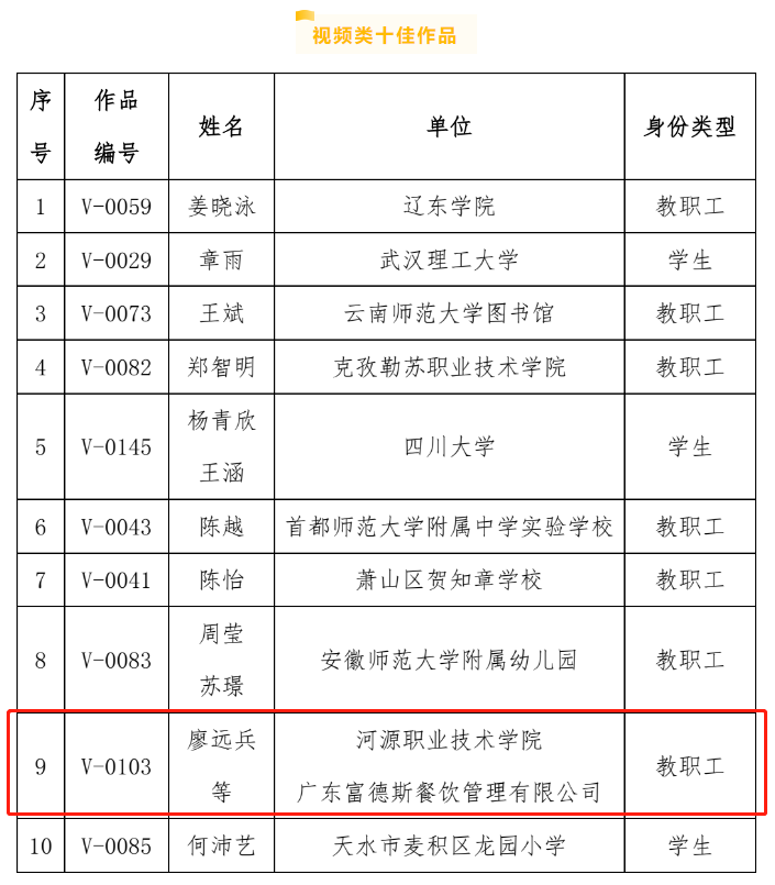为贯彻习近平总书记关于坚决制止餐饮浪费行为重要指示精神,根据《教育系统“制止餐饮浪费,培养节约习惯”行动方案》,本次活动由教育部主办,中国教育后勤协会承办。活动面向公众征集“美好‘食’光”主题参赛作品,共收到投稿作品4081件。经作品初评、专家评分、网络投票、专家评审会审议等程序,征集活动评选出标语类优秀作品20件(前十为十佳作品),海报类十佳作品和视频类十佳作品。我校与广东富德斯餐饮管理有限公司(廖远兵、何炳春、李兰芳、孙启兴、苏龙权)联合报送的视频作品脱颖而出,最终斩获“视频类十佳作品”奖项。