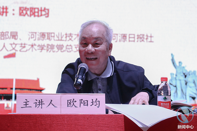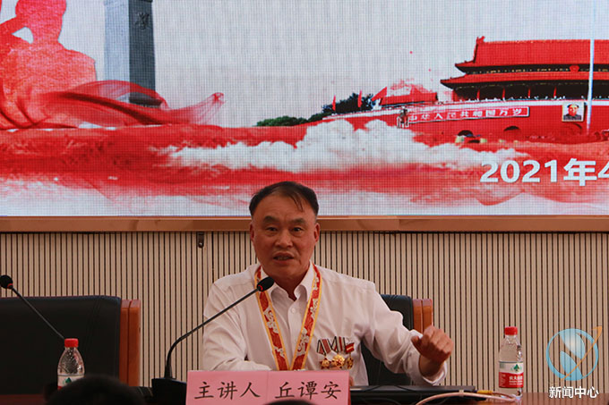 欧阳均、丘谭安分别以“我们的‘富强’观”“法卡山‘坚守英雄连’连长事迹”为主题作报告。欧阳均生动讲述了国家国富民强的伟大历程。丘谭安则向师生们讲述了自己1979年对越自卫反击战、1981年在法卡山坚守英雄连的作战经历。