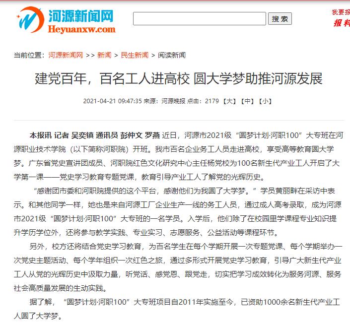 6、2021年4月21日,河源晚报报道《建党百年,百名工人进高校圆大学梦助推河源发展》,报道网址链接:http://www.heyuanxw.com/2021/ms_0421/69258.html