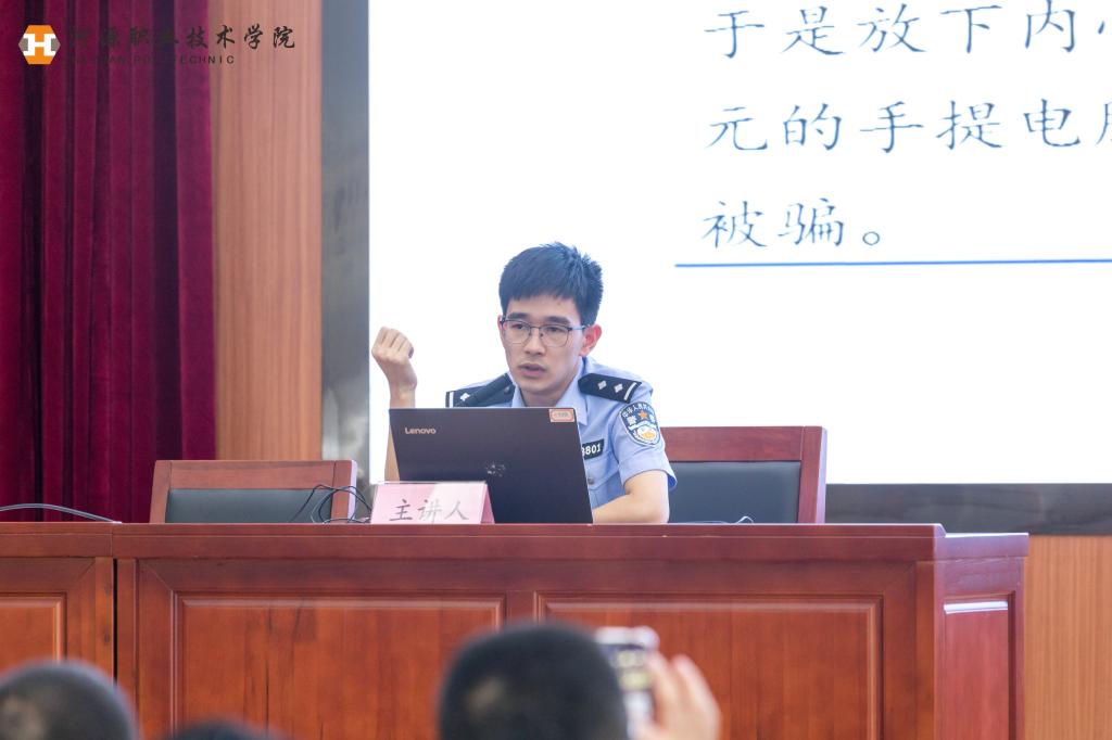 江东公安分局三级警长曾浩同志用自身工作经历,结合近年来学校涉电信诈骗情况的真实案例进行宣讲,他从网络诈骗的手段、如何防范网络诈骗、打击买卖银行卡电话卡等三个方面,为同学们带来了一场精彩的《防范网络诈骗安全教育讲座》。
