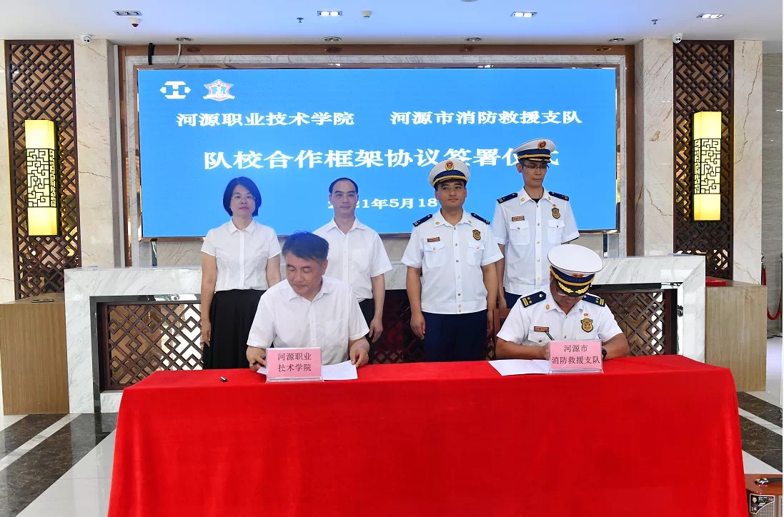 为深入贯彻习近平总书记关于消防工作重要指示精神,5月18日上午,我校与河源市消防救援支队在学术交流中心举行队校合作框架协议签约暨槎城“火焰蓝”学院揭牌仪式。市消防救援支队高罡政委、苗春国副政委、政治部陈裕富主任等机关全体干部及东源大队、源城大队、江东新区大队筹备组等指战员代表,学校陈德清校长、赖小景副校长,二级学院、保卫处及继续教育学院有关工作人员参加仪式。继续教育学院李文萍院长主持签约及揭牌仪式。