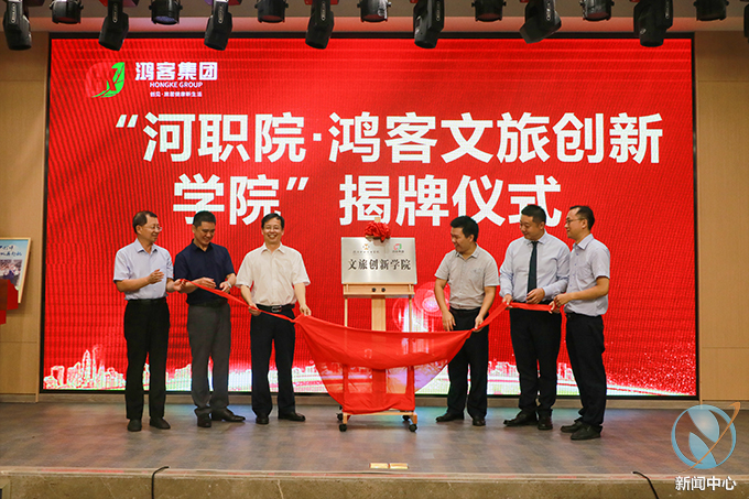 典礼最后,鸿客集团领导与我校领导一起为“河职院·鸿客文旅创新学院”正式挂牌。