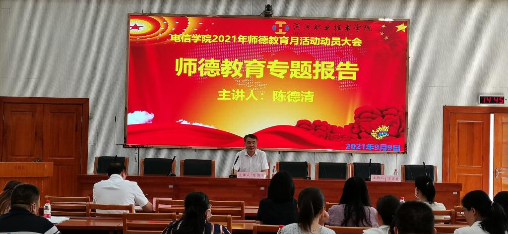 为深入学习习近平总书记在庆祝中国共产党成立100周年大会上重要讲话精神,深入贯彻落实党中央、国务院和省委、省政府关于全面深化新时代教师队伍建设改革工作的决策部署,进一步加强和改进新时代师德师风建设,根据《广东省教育厅关于开展2021年师德建设主题教育月活动的通知》及学校《关于开展2021年师德建设主题教育月活动的通知》的要求,2021年9月9月,电信学院在行政楼C108召开2021年师德教育月活动动员大会。