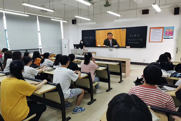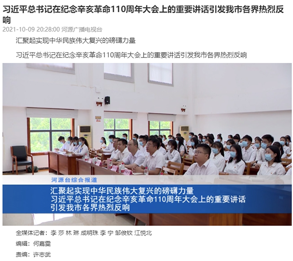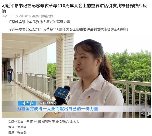 10月9日上午,纪念辛亥革命110周年大会在北京人民大会堂隆重举行。我校副校长赖小景、团委书记陈晓峰、团委办公室主任黄志远、各二级学院团总支书记以及各学院学生代表于行政楼C108利用网络视频收看了大会直播盛况,并认真聆听了中共中央总书记、国家主席、中央军委主席习近平在大会上发表的重要讲话。同时,我校各组织也结合学习工作实际,通过手机、电脑等途径在宿舍进行收看。