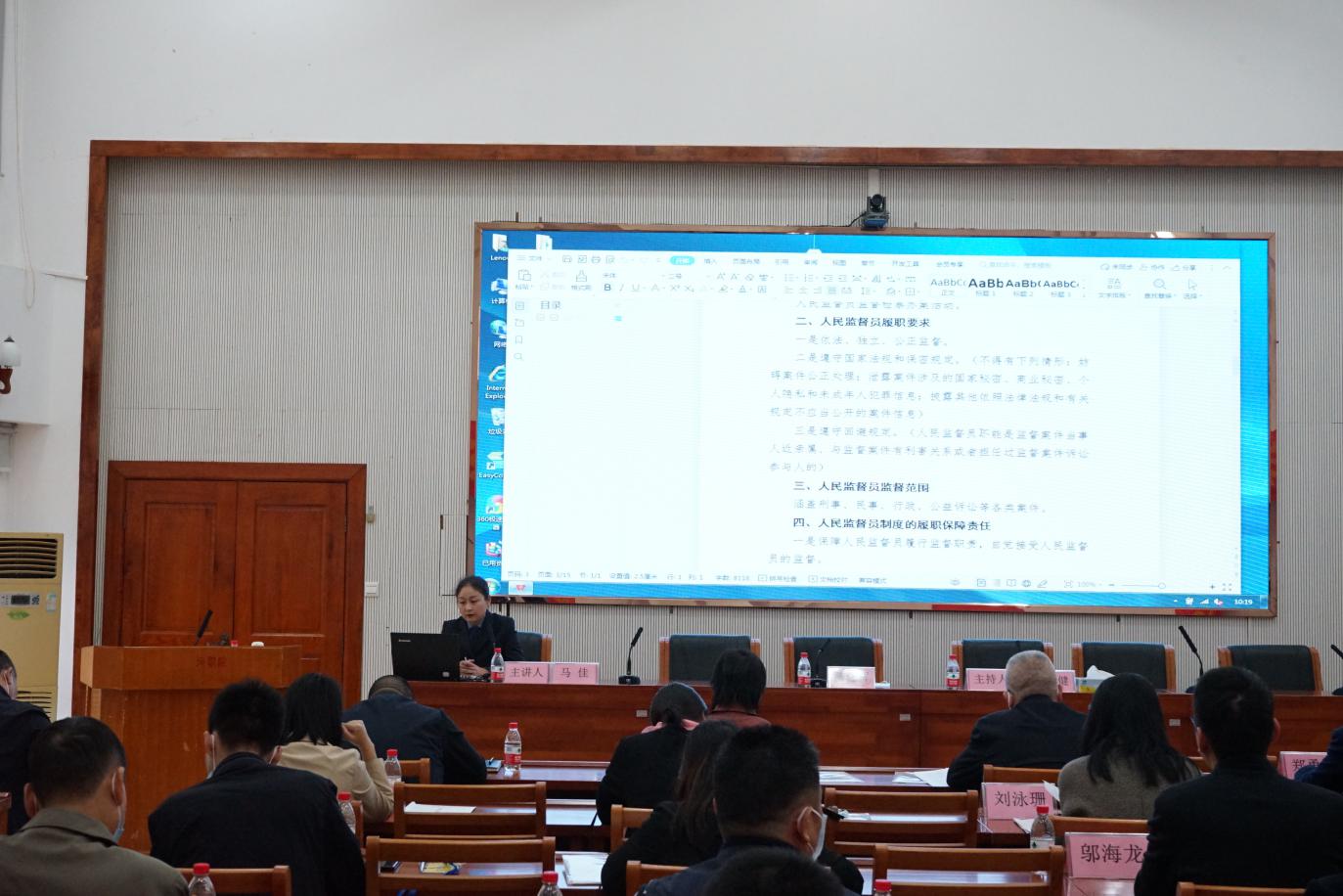 培训班邀请河源市人民检察院案件管理室主任、国家四级高级检察官马佳同志为学员们讲授了题为《发挥人民监督员作用,让检察办案更规范》的专题讲座,结合自身工作实际就《人民检察院办案活动接受人民监督员监督的规定》讲授了人民监督员职能定位、履职要求、监督范围、履职保障责任等,并重点讲解了人民监督员监督的十种具体方式。