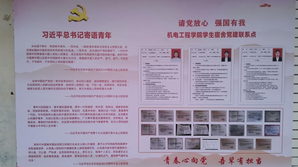 11月9日,我校机电工程学院党总支举行首批学生宿舍党建联系点建设和学生党员宿舍挂牌仪式。学校党委委员、副校长赖小景,学院党总支书记、院长钟建坤及学院班子成员,学生支部全体党员及学生代表参加仪式。