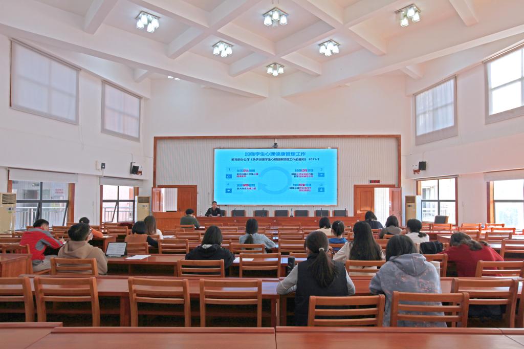 会上,戴佰阳处长传达了教育部办公厅发布的《关于加强学生心理健康管理工作的通知》精神,并提出四点建议,一是加强源头管理,全方位提升学生心理健康素养,加强学生心理健康课程建设,大力培育学生积极心理品质,鼓励学生多运动,积极参与劳动教育,养成运动习惯;二是加强过程管理,提升及早发现能力和日常咨询辅导水平,辅导员应多深入宿舍与学生面对面交流,及早发现问题及早处理问题;三是加强结果管理,提高心理危机事件干预处置能力;四是加强保障管理,加大综合支撑力度。戴佰阳处长强调,辅导员与心理教师应加强心理建设,不要给自己过多压力,有需要时多与学校沟通解决。