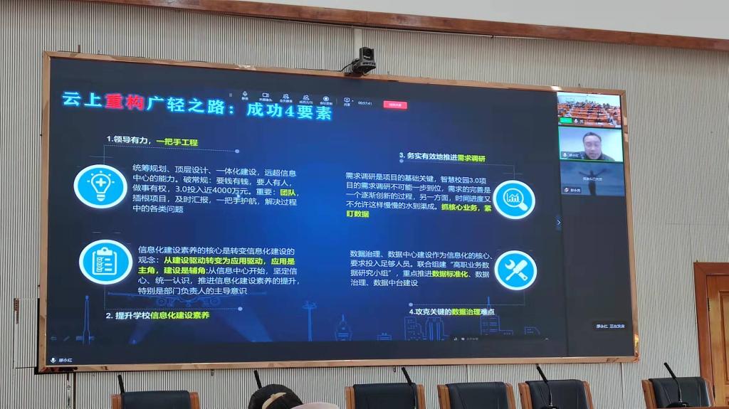 会上,首先由广东轻工职业技术学院廖永红教授做主题为《云上重构广轻之路(2019-2021)》的报告。廖教授以广轻工智慧校园3.0建设实践为基本思路,从“三大一强”(即大教学、大管理、大保障、强督察)一体化智慧校园方面建设成效进行介绍,总结了广轻工智慧校园3.0成功的四要素为:1.领导有力,一把手工程;2.提升学校信息化建设素养;3.务实有效地推进需求调研;4.攻克关键的数据治理难点。