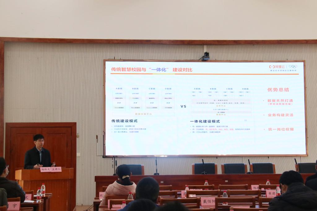 接着,阿里巴巴集团控股有限公司高级架构师杨聆允做了主题为《阿里云上一体化智慧校园方案宣讲》的报告,他从阿里云技术架构、智慧校园一体化建设的优势等方面进行了介绍。