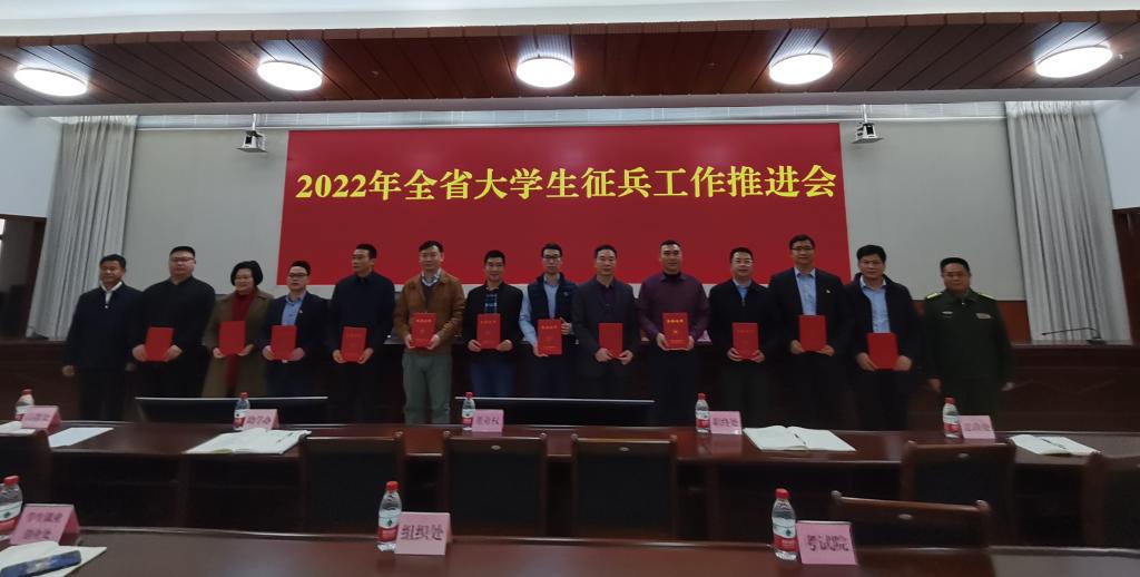2月10日,省教育厅召开2022年全省大学生征兵工作推进会。省教育厅二级巡视员邱克楠,省征兵办副主任、省军区动员局副局长宋纯武出席会议。会议传达了全国征兵工作会议精神,对我省高校2021年度征兵工作作了全面总结,对今年征兵工作进行了周密部署,并对2021年度高校征兵工作先进单位和先进个人进行了表彰。我校被评为2021年度征兵工作先进单位,武装部邓伟昌部长被授予"征兵工作先进个人"称号。