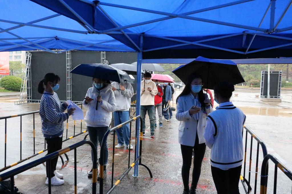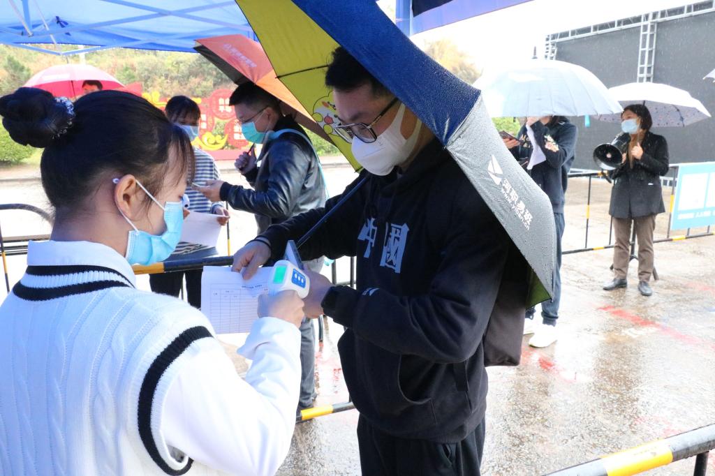 校领导在学校东门观摩学生返校防疫模拟演练