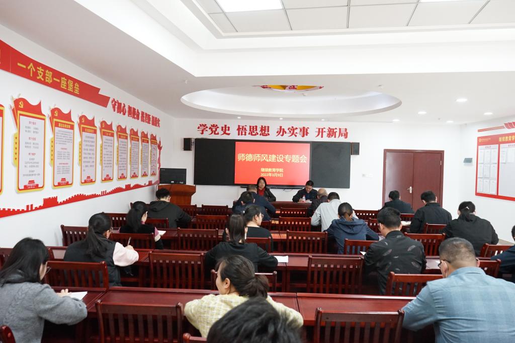 为深入贯彻落实习近平总书记关于新时代教师队伍师德师风建设的重要论述,扎实推进学院师德师风建设工作,落实立德树人根本任务,抓好教师队伍建设,推动学校继续教育高质量发展,3月9日下午,继续教育学院在党员活动室召开师德师风建设工作推进会,袁光华副校长、学院全体教师参加会议。