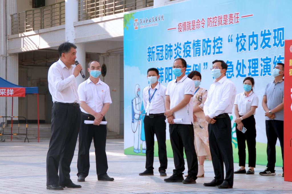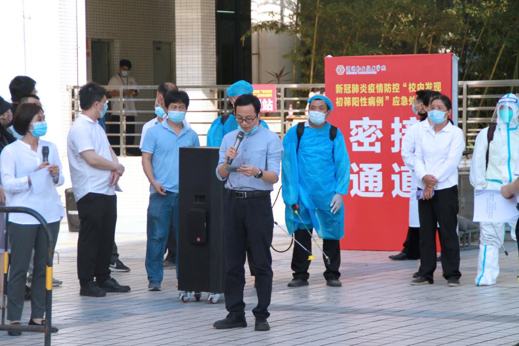 为进一步落实省、市关于高校新冠肺炎疫情防控工作要求,提高我校疫情防控的应急处置能力,4月12日,我校在教学楼中庭开展新冠肺炎疫情防控“校内发现初筛阳性病例”应急处理演练。全体校领导,各部门负责人,各学院副书记,全体辅导员,学工处、资产后勤处、保卫处全体人员,各第三方机构代表、师生代表全程参与并观摩演练。此次演练由副校长赖小景任总指挥。
