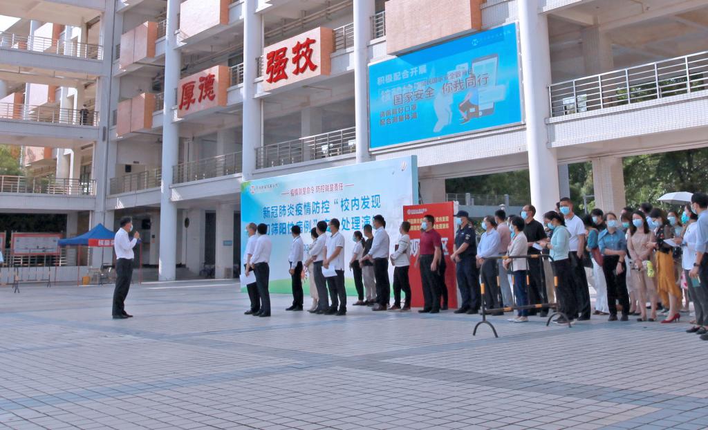 陈德清校长宣布应急处理演练正式开始。本次演练以学校接到江东新区疫情防控指挥办告知我校一名学生张某新冠病毒核酸初筛检测阳性为场景,模拟了学校启动应急处置响应、封控校园、联系相关家长、专车转送阳性病例和密接者、校内全员核酸检测、在市疾控中心指导下对相关场所进行终末消毒并立即组织全校消杀工作、完成全员核酸检测后通知全体师生服从学校安排做好个人防护等多个场景。演练过程涵盖信息接收、层级报告、上级指令、人员排查及转运、宿舍及公共区域消毒、密接人员限制流动、舆情监控、信息发布等环节。各部门分工明确、协调联动、处置果断有序,既全面检验了我校疫情防控应急处置能力,也为学校疫情防控工作精准化实施积累了宝贵的经验。