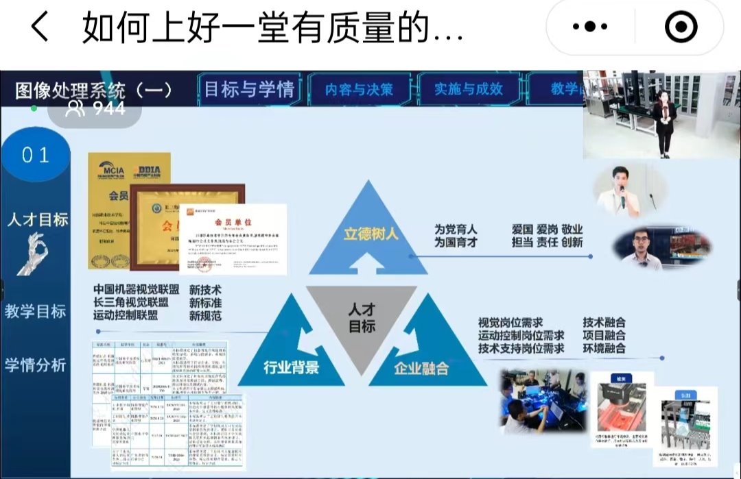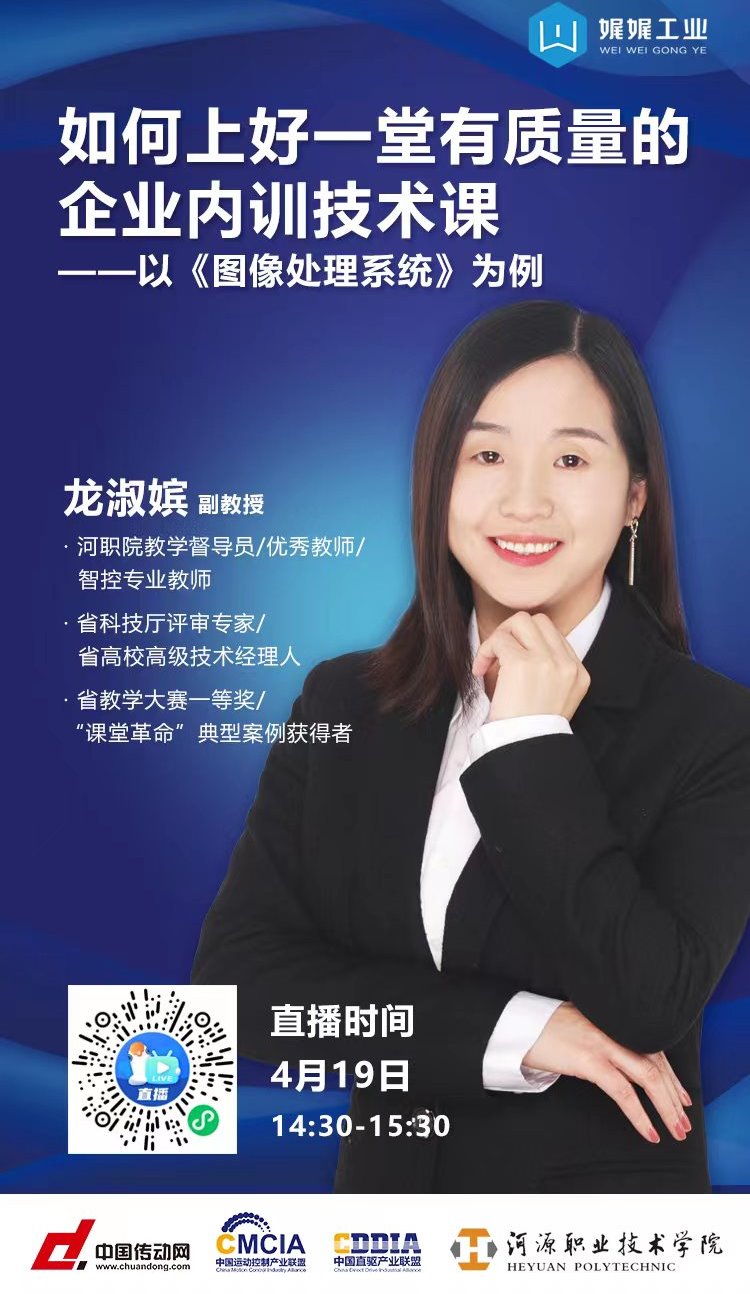 4月19日下午,我校智能控制技术专业教师龙淑嫔副教授应中国传动网、中国运动控制产业联盟和中国直驱产业联盟邀请,在娓娓工业平台开展了“如何上好一堂有质量的企业内训技术课—以《图像处理系统》为例”的线上专题培训。