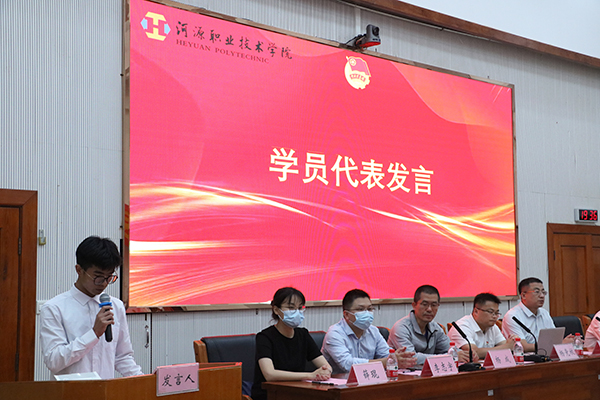 在庄严神圣的国歌声中,开班仪式拉开了序幕。首先由新学员代表李佳帆上台发言,他表示青春寄予希望,青年创造美好未来,时代造就青年,盛世成就青年。广大青年在中国共产党的旗帜下,用奋斗和拼搏,创造了无愧于祖国、无愧于人民、无愧于时代的光辉业绩,赢得了党和人民的高度赞誉。无论是过去、现在、还是未来,中国青年始终是实现中华民族伟大复兴的先锋力量。习近平总书记说过“一代人有一代人的长征,一代人有一代人的担当!实现中华民族伟大复兴是一场接力跑。”我们已经握好了时代的接力棒,决心为实现中华民族伟大复兴注入源源不断的青春力量。随后,由出席的老师们为青马工程培训班学员代表授书。接着,由陈晓峰书记进行发言,他指出,作为新时代青年,我们要以‘胸怀大我’的爱国情怀,以超越自我的奋进姿态,认真践行请党放心、强国有子我的青春誓言,在实现中华民族伟大复兴的时代洪流中踔厉奋发、勇毅前进。最后开班仪式在全体人员激情澎湃地齐唱团歌后圆满落幕。