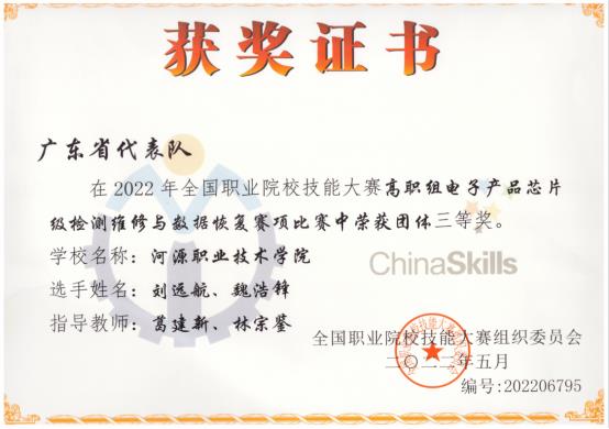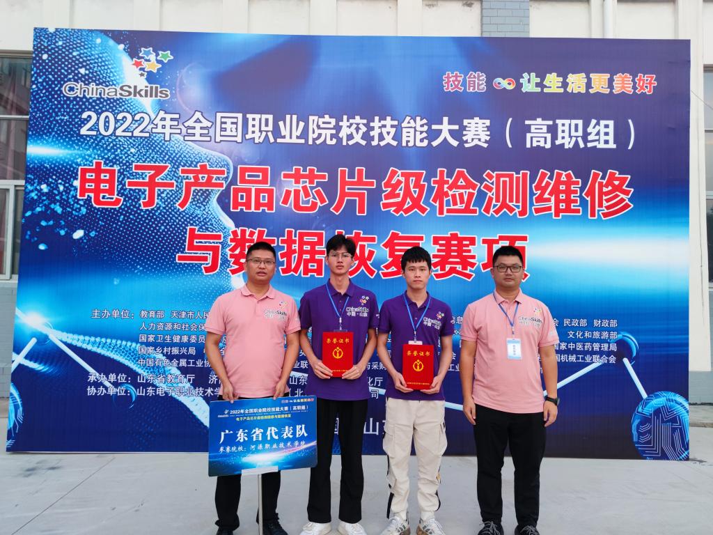 2022年全国职业院校技能大赛高职组“电子产品芯片级检测维修与数据恢复”赛项于8月23日至25日在山东电子职业技术学院举行。我校由电子与信息工程学院刘远航、魏浩锋2名学生组成的参赛队与来自全国的50所高职高专院校的100名选手同台竞技。2名学生沉着应战,努力拼搏,最终脱颖而出,获得本次比赛三等奖的好成绩。