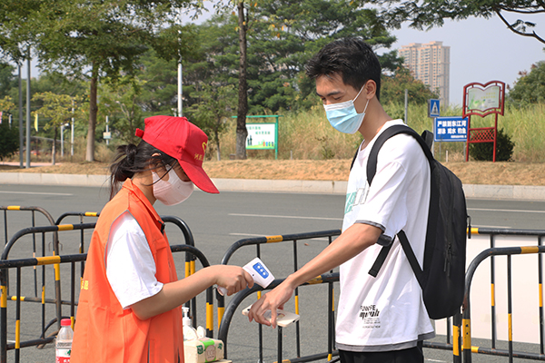 返校前,志愿者参加志愿服务工作培训会,在会上明确了志愿者管理、分工、志愿服务时间、地点以及要求等相关内容,也多次强调在志愿服务返校学生的同时,志愿者们务必要做好自我防护,并服从学校统一安排,勇敢地站在校园防“疫”第一线,为顺利返校提供志愿服务。工作中,志愿者遵循疫情防控要求,毫不懈怠,检查返校学生的粤康码、行程卡,并给学生测体温,检查无误后方可入校。