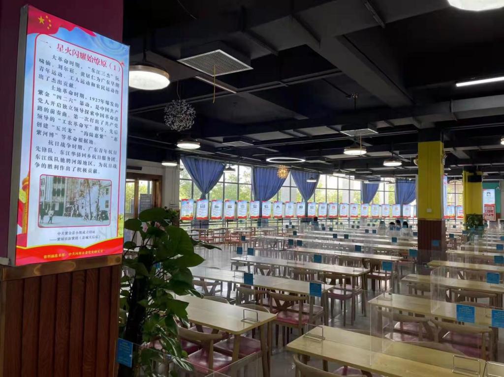 第二食堂定位为红色文化主题食堂,设置了党建知识、党史学习教育和河源革命史学习教育专栏,全面展示了中国共产党百年波澜壮阔的奋斗历程,详细介绍了河源籍革命烈士、重大党史事件,以及全市50个党史学习教育基地等,为师生全方位多角度学习党史提供了更加直观的课堂。