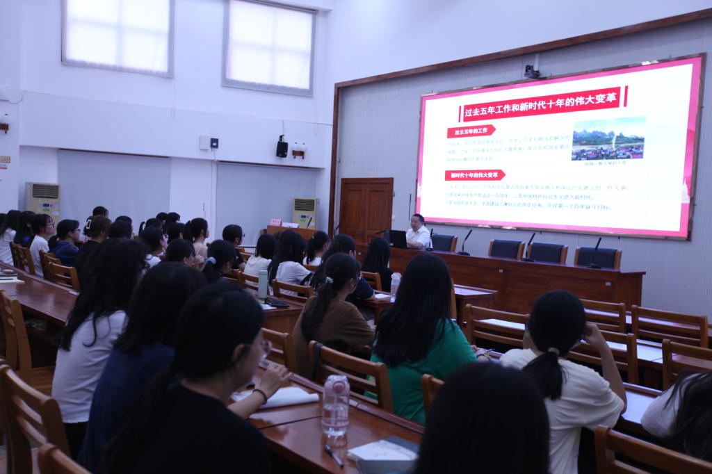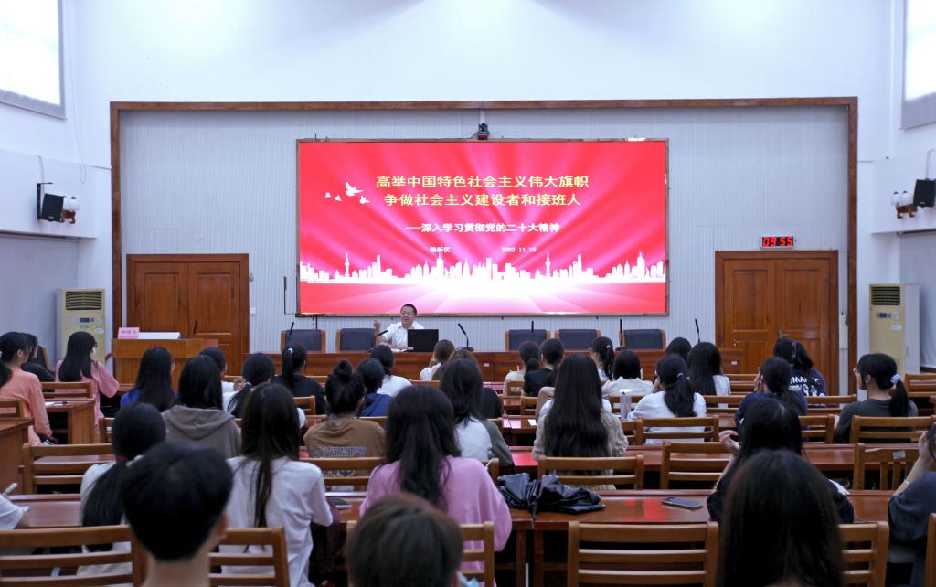 赖新优紧扣党的二十大报告原文,从党的二十大主题和核心内容;过去五年的工作和新时代十年的伟大变革;党的二十大召开的国际国内背景;党的二十大报告的新观点、新论断、新思想;党的二十大的宏伟蓝图和行动纲领;党的二十大对青年提出使命要求;培养担当民族复兴大任的时代新人等七个方面,用详实的数据和生动的案例为师生上了一场主题鲜明、内容丰富的宣讲会。赖新优强调,新时代的大学生要深刻领会党的二十大精神丰富内涵和实践要求,苦练技能,担当使命,让青春之花在全面建设社会主义现代化国家的奋斗征程中绽放。