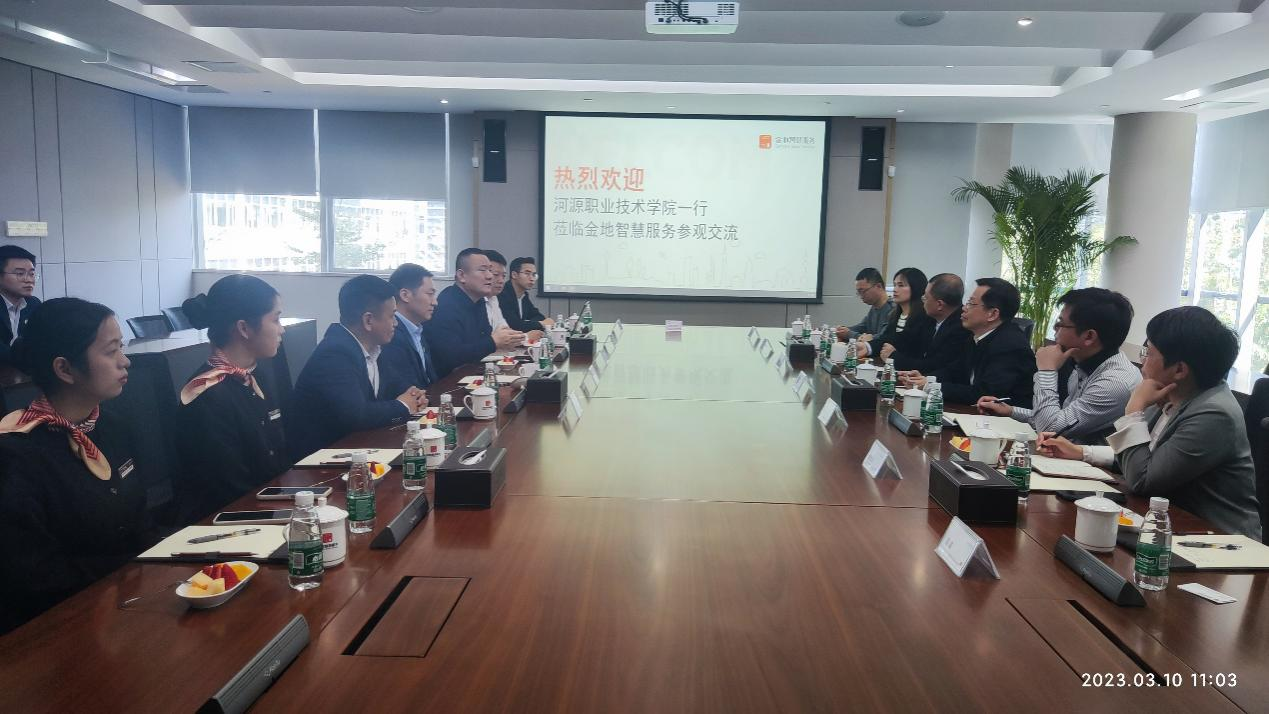 在金地物业公司总部,韦荣书记一行与金地物业公司管理层进行了友好交流,就订单班的发展规划和未来与金地物业的合作展开了多方面的深入探讨,包括物业管理专业、酒店管理专业、旅游管理专业、楼宇智能化专业、园林专业等专业与金地公司开展全方位校企合作,并与实习的学生进行了互动交流。