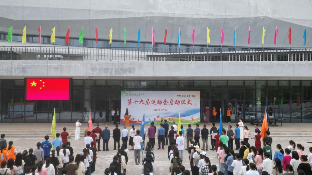 在仪式上,大屏幕显示出五星红旗,伴随着国歌响起,全体人员肃立,行注目礼,启动仪式在庄严的升旗仪式中拉开序幕。礼毕,校长陈德清上台发表致辞,他表示,此次运动会是学校贯彻党的二十大精神有关体育论述的重要活动,是深入推动全民健身计划的实施,进一步丰富广大师生文体生活的重要途径,是精神文明建设的有效举措,有利于推动我校新时代学校体育工作高质量发展。我校高度重视学校体育工作,始终坚持健康第一的教育理念,积极倡导“无体育、不河职”的体育精神。陈德清校长希望我校学子要把体育健身同刻苦学习专业技能结合起来,把弘扬中华体育精神同坚定文化自信结合起来,在比赛中大力弘扬“更快、更高、更强”的奥林匹克精神,发扬不畏艰难、团结拼搏、勇于挑战、勇于超越的体育精神,赛出风格、赛出水平。