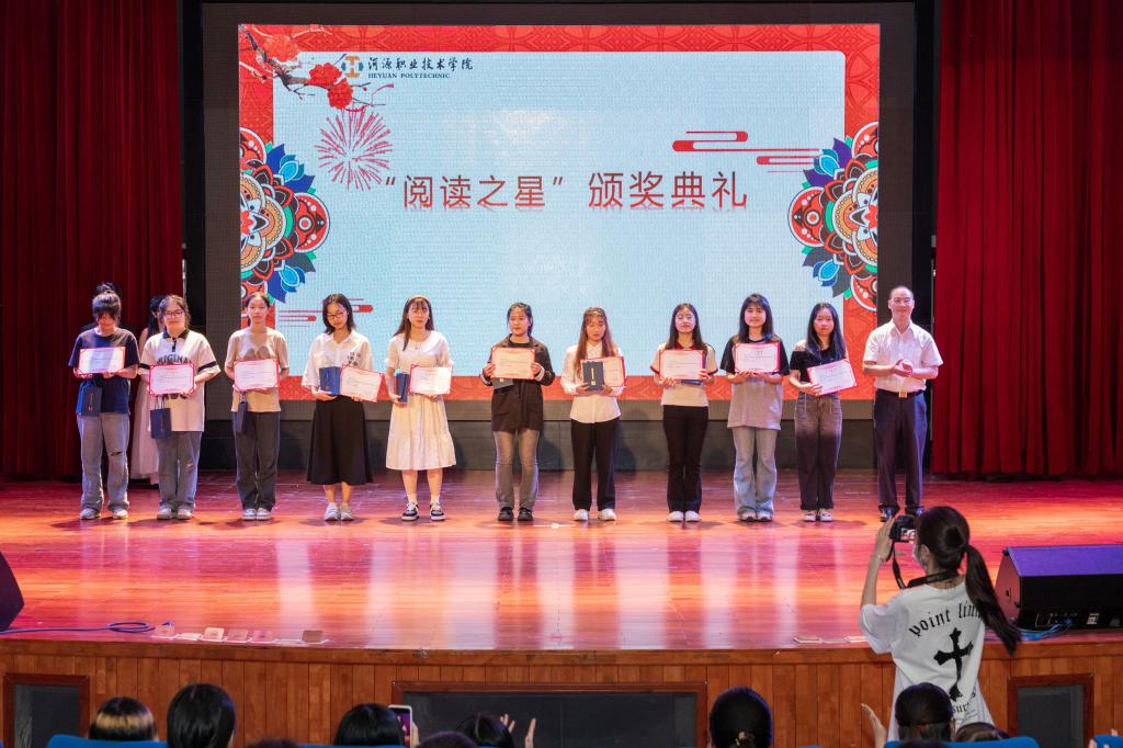 赖小景副校长为评选为“阅读之星”的学生颁奖,获奖学生手中红色证书是对他们坚持良好阅读习惯的肯定和鼓励。
