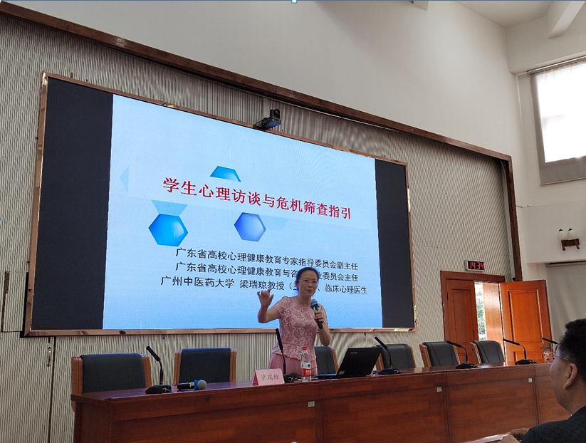 9月4日下午,我校特邀广州中医药大学梁瑞琼教授为我校全体学工人员开展心理健康教育场景讲座,讲座主题为“学生心理访谈与危机筛查指引”,学校姚家芳副校长主持。